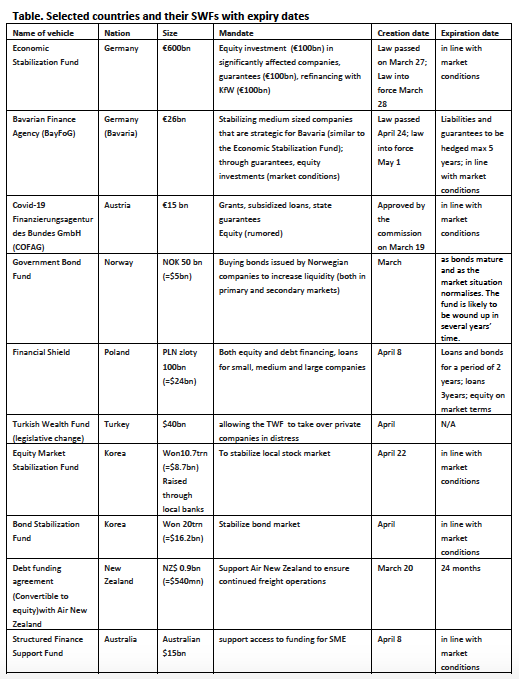 Such a mechanism will also allow states to participate in the economic recovery that the public spending is geared to facilitate, and ensures to avoid handing out money without conditionality to hard hit sectors. That helps to offset voter’s distrust about large bailouts in the past, and assures accountability to the taxpayer. Due to these benefits, in April 2020, Germany created an Economic Stabilization Fund Wirtschaftsstabilisierungsfonds, with € 600bn in assets, of which €100bn is for equity investments, €400bn for guarantees, and €100bn for refinancing through Germany’s state owned development bank the KfW Group. Similarly, the Austrian government has created the agency, COVID-19 Finanzierungsagentur des Bundes COFAG. Norway has created the Government Bond Fund as a temporary measure with $5bn to facilitate access to liquidity for major companies during the Coronavirus outbreak (see table).