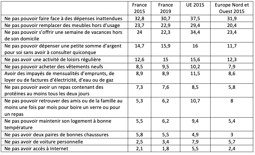 L’impact effectif de la pauvreté sur la vie menée est donc certainement mieux saisi par l’indicateur de privation matérielle et sociale. Il s’approche d’une définition absolue (et non plus relative) de la pauvreté. L’INSEE (et Eurostat pour l’ensemble des pays de l’Union) construisent cet indicateur en interrogeant des échantillons représentatifs sur treize dépenses que les personnes ne pourraient pas couvrir, dépenses jugées nécessaires pour mener une vie normale. Ces dépenses comprennent des biens matériels (comme le fait de ne pas pouvoir acheter de vêtements neufs), des éléments de confort du logement (comme le fait de ne pouvoir maintenir le logement à une bonne température), des problèmes d’arriérés ou de dettes, et concernent aussi des pratiques de loisirs ou des sorties. Le fait de ne pas pouvoir manger à sa faim n’est pas mentionné stricto sensu, mais une question aborde néanmoins ce sujet. J’y reviendrai. Les indicateurs statistiques de ce type ont toujours une part d’arbitraire dans le choix des items. Cette part d’arbitraire tient aussi au fait qu’Eurostat définit un nombre minimum de privations (5) à partir duquel une personne est dite « en difficulté matérielle et sociale ». Mais cette standardisation est nécessaire pour pouvoir suivre l’indicateur dans le temps et le comparer entre pays. Cette comparaison des privations a évidemment plus de sens que la comparaison des taux de pauvreté monétaire comme je l’ai expliqué auparavant.