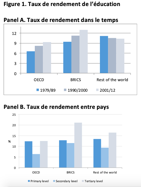 Mais des données plus récentes (et qui font désormais référence) dressent un tableau différent. Elles suggèrent que les rendements moyens de l’éducation primaire, secondaire et tertiaire sont en forme de U par rapport au temps passé dans l’éducation, et non pas linéaires comme on le supposait auparavant (Psacharopoulos et Patrinos, 2004 ; Montenegro et Patrinos, 2014). Par ailleurs ces données montrent que les rendements varient considérablement d’un pays à l’autre. Les différences au sein des pays de l’OCDE peuvent ainsi atteindre 10 points de pourcentage, et il apparaît aussi les rendements du capital humain dans les BRICS et le reste du monde sont nettement plus élevés que dans l’OCDE. Ces données indiquent enfin que les rendements moyens ont augmenté au fil du temps, tant dans les pays de l’OCDE que dans les BRICS (figure 1).