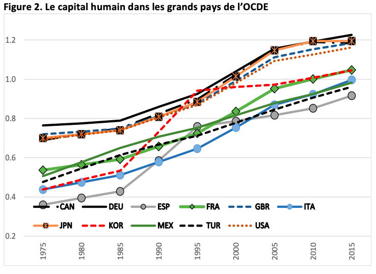 Le tableau 2, ci-dessous, montre l’évolution du capital humain ainsi mesuré, pour les grands pays de l’OCDE. Les courbes sembleront familières aux lecteurs économistes : cette nouvelle mesure macroéconomique du capital humain présente un lien positif statistiquement significatif avec la productivité globale des facteurs.