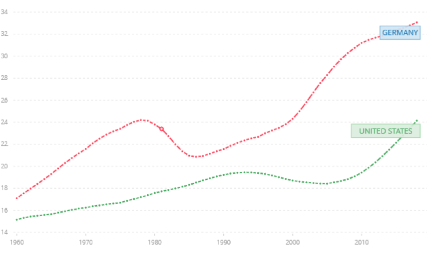 Figure 1. Taux de dépendance vieillesse : Allemagne vs États-Unis