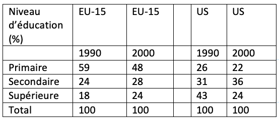 Tableau 1. Population immigrée, par niveau d'éducation, en pourcentage du total pour l'UE-15 et les États-Unis et l'UE-15, 1990 et 2000.