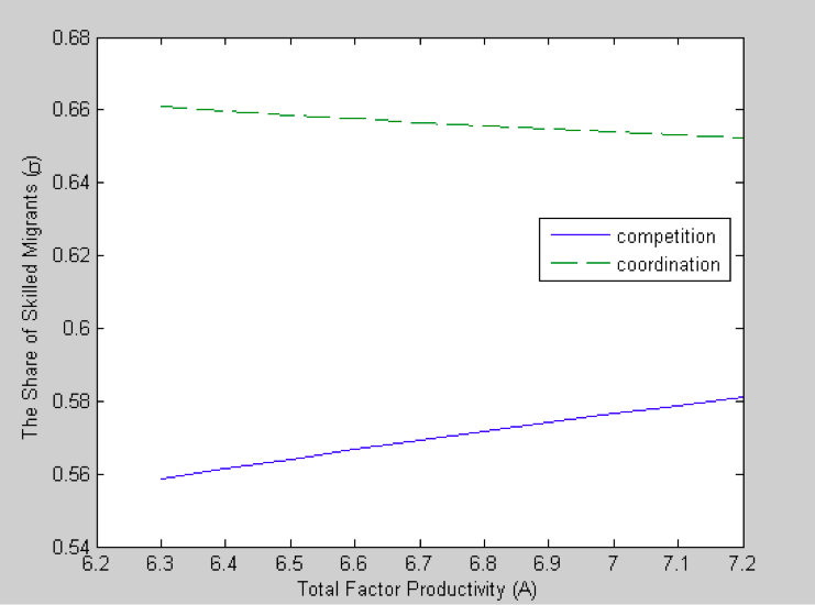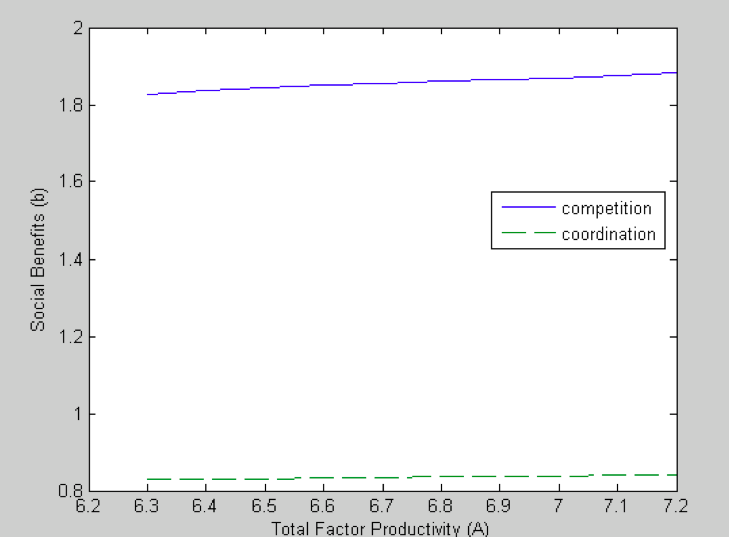 La figure 2 illustre les prestations sociales (b comme benefits) sous les deux régimes institutionnels (concurrence et coordination) pour différents niveaux de productivité totale des facteurs (A). La figure 4 illustre la part de personnes très qualifiées dans l’immigration totale (σ) sous les deux régimes institutionnels, pour différents niveaux de productivité totale des facteurs (A). Comme résultat secondaire, nous notons que les prestations sociales augmentent dans les deux régimes lorsque la productivité totale des facteurs augmente. Ce résultat est attendu : une économie plus riche peut se permettre d'accorder à ses résidents un niveau plus élevé de prestations sociales.