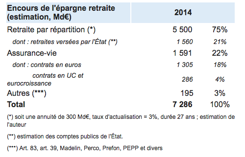 Dans la plupart des pays, ce second socle de retraite est construit sur l’instrument des fonds de pension. En France, non seulement le socle capitalisation n’est pas assez important, mais en plus les fonds de pension n’existent que très peu (sous forme de Perco, art. 83, art 39, Madelin…). Le tableau qui suit donne une ventilation des systèmes de retraite en France en 2014, ceci en estimant, un peu héroïquement, ce que représente l’« encours » des retraites par répartition. On y voit l’importance de l’assurance-vie et la faiblesse des fonds de pension :