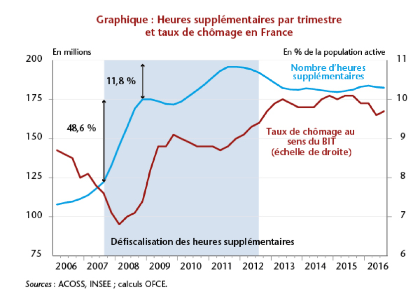 2 - On doute très vite au vu du graphique que cette hausse ait représenté une croissance de l’activité en termes d’heures de travail : la croissance du PIB sur la période a été très faible et le chômage ne s’est pas réduit (au cœur il est vrai de la violente récession de 2009). Le plus probable – confirmé par exemple par une étude de Cahuc-Carcillo (2012) – est un simple effet de substitution d’heures normales en heures sup. Le gain fiscal et social pousse les employeurs – avec la complicité des salariés puisqu’ils y trouvent leur intérêt – à déclarer en heures sup ce qu’ils payaient auparavant par exemple sous forme de primes ou d’heures normales effectuées un autre jour. Ainsi, non seulement la mesure ne crée pas vraiment d’emplois, mais pas non plus un surcroît d’heures travaillées.