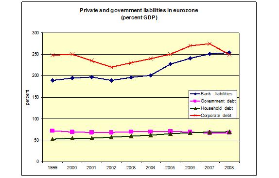 Les pays de la zone euro avaient institué un mécanisme sophistiqué, le Pacte de stabilité et de croissance (PSC), afin de maintenir sous contrôle la dette et les déficits publics. Mais, et on peut s’en étonner, aucun mécanisme n’avait été prévu pour contrôler et contenir la dette privée, alors même que les gouvernements garantissaient implicitement des parts significatives de la dette privée, notamment celle des institutions financières. Ainsi, l'explosion de la dette privée dans la période 1999 à 2008 était une bombe à retardement qui amorçait l’explosion de la dette publique. Mais personne, parmi les créateurs du PSC, ne semble avoir remarqué ce risque d’explosions en chaîne. Assurément, il y a là une grave erreur de conception.