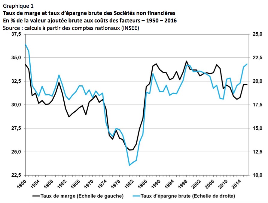 On peut ironiser sur le fait que les deux épisodes de rétablissement total (durant la décennie 1980) ou partiel (sur les dernières années) du taux de marge se soient produits sous des présidences de gauche : François Mitterrand et François Hollande. Mais, plus sérieusement, il faut souligner que le rétablissement des dernières années est partiel : la moitié seulement de la baisse du taux de marge induite par la crise a été rattrapée. Et ceci malgré les transferts de grande ampleur opérés sur ces années en faveur des entreprises, comme par exemple le CICE ou le pacte de responsabilité. Cela signifie simplement que, en valeur, la croissance des couts salariaux est demeurée proche de celle de la productivité, interdisant un rétablissement plus complet voire total du taux de marge.
