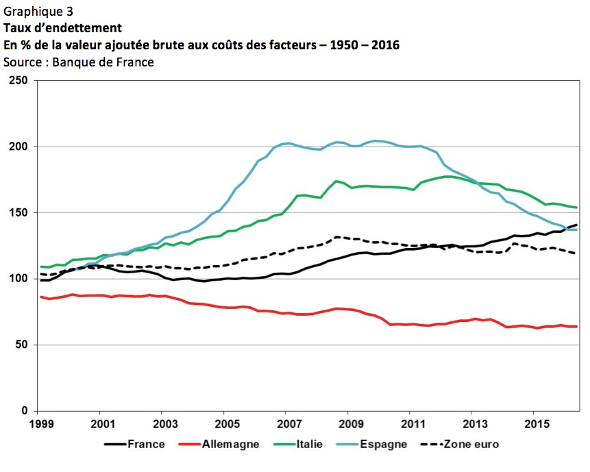L’un des facteurs de fragilisation de la situation financière des SNF est bien sûr la hausse de leur taux d’endettement. Cette hausse contraste avec les évolutions du taux d’endettement observées dans d’autres grands pays (Graphique 3). Nous avions en décembre 2016, dans une tribune aux Echos, avancé une explication de ce particularisme. La taxation marginale du capital est en France plus élevée que dans les autres pays développés, cette situation ayant été amplifiée par l’existence de l’ISF et les réformes introduite en 2013 supprimant le prélèvement forfaitaire sur les revenus du capital désormais traités comme les revenus du travail. Comme l’a montré l’OFCE, les taux de taxation marginale peuvent ainsi atteindre des niveaux très élevés. Pour attirer l’épargne résidente, les entreprises sont amenées à compenser cela par une distribution généreuse de dividendes qui abaisse leurs capacités de financement de l’investissement, ce qui contribue à l’augmentation de leur endettement. Dans le même temps, cette distribution généreuse de dividendes enrichit les fournisseurs d’épargne non-résidents, ce qui n’est pas l’objectif recherché.