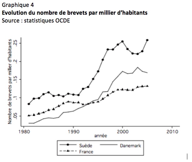 Au début des années 1990, la Suède se caractérise par une dette publique élevée (proche de 85 % du PIB), un chômage élevé, une production en stagnation, et une grogne de la part des artistes (on se souvient des réactions d’Ingmar Bergman et d’Astrid) et des entrepreneurs (notamment avec l’exil de Kamprad, fondateur d’Ikea) contre le système fiscal alors en vigueur. Ce système se distinguait par un impôt sur les revenus du capital progressif dont le taux marginal maximum était de 72% et dont le taux moyen était de 54%, par un impôt sur les sociétés de 58%, et par un impôt sur la fortune (qui ne rapportait guère plus de 2,5 milliards d’euros par an). La réforme fiscale de 1991 a fait converger la fiscalité suédoise vers celle des autres pays d’Europe du Nord, en particulier avec la suppression de l’impôt sur la fortune et le passage à la taxation forfaitaire à 30% des revenus du capital. Résultat : le taux de croissance de la productivité a plus que quadruplé entre avant et après la reforme, et il y a eu un véritable décollage du nombre de brevets (voir Graphique 4). Et les Suédois ont opéré cette transformation tout en demeurant l’un des pays les moins inégalitaires au monde : en 2010, l’indicateur Gini qui mesure le degré d’équité dans la distribution des revenus après impôts, plaçaient la Suède en seconde position au sein de l’OCDE juste après le Danemark et devant la France. Au total, les Suédois ont su réconcilier croissance par l’innovation, mobilité sociale (celle-ci n’a nullement diminué depuis 1991) et protection sociale. Ils nous indiquent le chemin à suivre.