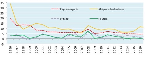 Graphique 1 : Inflation dans diverses régions depuis 1996 (moyenne annuelle)