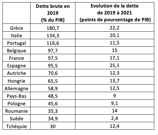 Les pays qui ont le plus augmenté la dette sont aussi les pays qui étaient déjà le plus endettés avant la crise sanitaire : Grèce, Espagne, Italie, France et Belgique. Le Portugal fait un peu figure d’exception, avec une augmentation modérée de sa dette.