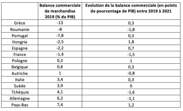 Sur les 14 grands pays européens étudiés, un peu moins de la moitié (six sur 14) abordaient en 2019 la crise sanitaire avec un déficit commercial : Hongrie, Espagne, Roumanie, Portugal, Grèce et France. Parmi ces pays, seuls deux pays voient leur déficit commercial se creuser encore lors de la crise : la Roumanie et la France. Les autres ont trouvé la solution pour ne pas creuser leur déficit commercial avec la crise sanitaire.