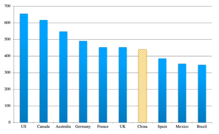 Figure 1. Surface résidentielle moyenne par personne par pays en 2017 (en pieds carrés).