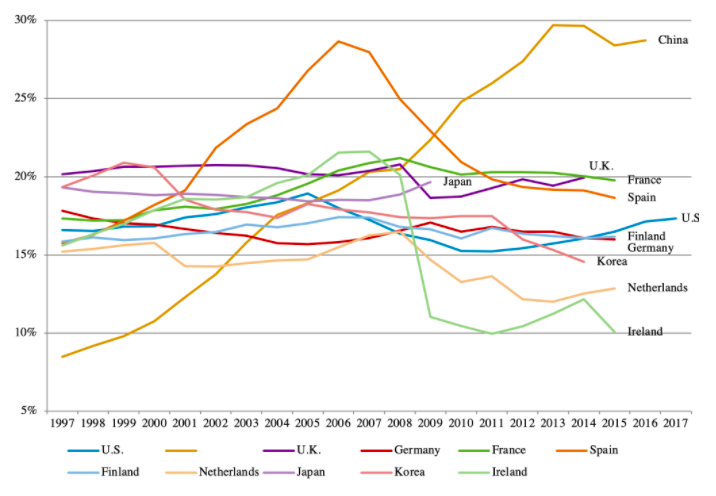 Note. Cette figure présente l'impact des activités liées à l'immobilier sur le PIB total en Chine, aux États-Unis, au Royaume-Uni, en Allemagne, en France, en Espagne, aux Pays-Bas, en Finlande, en Irlande, au Japon et en Corée.