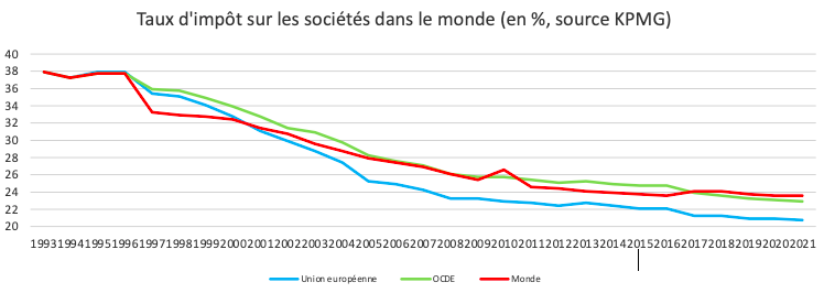 La réalité est bien sûr tout autre. Par évasion fiscale, l’entreprise laisse son investissement en France et déplace ses profits en Irlande. Ainsi, elle se fait rembourser ses dépenses à 28% en France et acquitte 12,5% sur ses profits en Irlande. Le fisc français se fait voler la différence par le fisc irlandais à hauteur de 12,5% et par l’actionnaire pour le reste. La réaction première, défensive et non coordonnée d’un État à une telle prédation est de baisser son taux et ainsi d’entamer une spirale baissière. Comme le montre le graphique qui suit, c’est bien dans un mouvement de la sorte que se sont engagés tous les grands pays de la  planète.