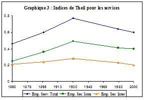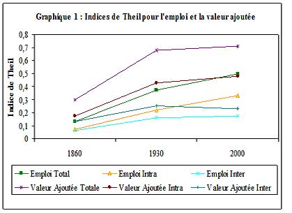 Le graphique 1 prouve que l’emploi s’est fortement concentré dans l’espace français au cours des 140 dernières années : notre indice est trois fois plus élevé en 2000 qu’en 1860. De plus, bien que la valeur ajoutée soit toujours plus inégalement répartie que l’emploi, elle se concentre moins rapidement. Sur la période 1860-1930, les inégalités évoluent de manière similaire entre et à l’intérieur des régions. Sur la période 1930-2000, les disparités entre régions sont remarquablement stables, de sorte que l’augmentation des inégalités est principalement dictée par les évolutions intra-régionales. Quelques départements, vraisemblablement ceux hébergeant la capitale régionale, ont donc vu leur attractivité se renforcer au détriment des autres départements de la région.