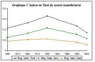 Au-delà de ce constat, l’analyse peut être affinée au niveau sectoriel. Par exemple, dans le cas de l’industrie, on constate une forte augmentation de la concentration spatiale sur la période 1860-1930, mais cette tendance s’inverse à la période suivante, le degré de concentration en 2000 étant même inférieur à celui de 1860.