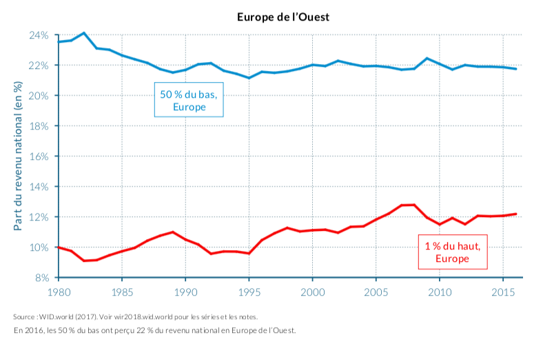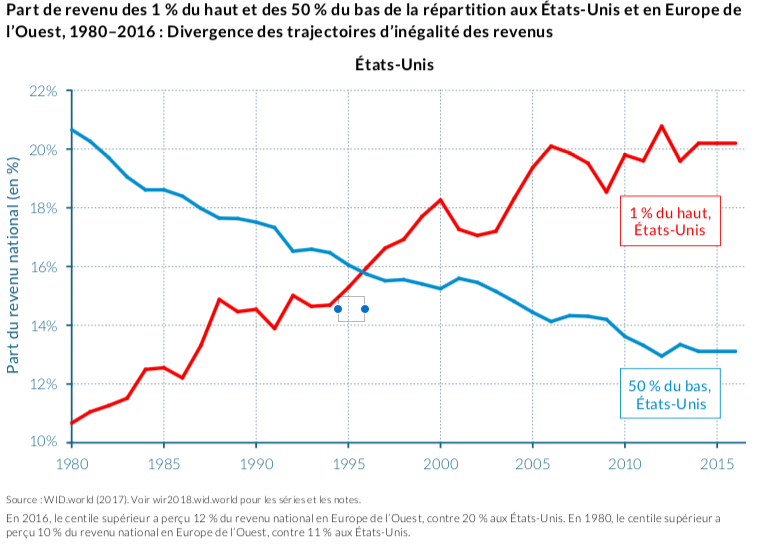 Le même rapport regarde de plus près ce qui s’est passé en Europe et aux États-Unis. La figure qui suit compare la part des revenus des très riches (les 1% des revenus les plus élevés) et celle des 50% les moins riches. Entre 1980 et 2016, en Europe, les plus riches ont capté 2% de plus du revenu national alors que la part des 50% les moins riches a reculé de 2%. Aux États-Unis, c’est un changement radical qui a eu lieu. Tout cela montre que les inégalités se sont aggravées, mais très légèrement en Europe. Dire que l’écart que l’écart est devenu « abyssal » est donc inexact.