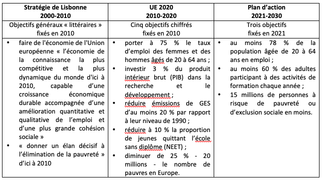 Trois objectifs communs ont été établis à cette occasion. À l’horizon 2030, l’UE se donne donc trois grandes ambitions chiffrées : au moins 78% de la population âgée de 20 à 64 ans en emploi ; au moins 60% des adultes participant à des activités de formation chaque année ; 15 millions de personnes à risque de pauvreté ou d’exclusion sociale en moins.