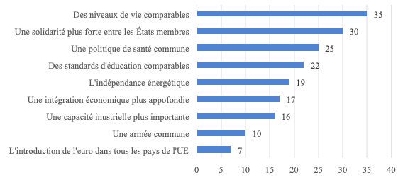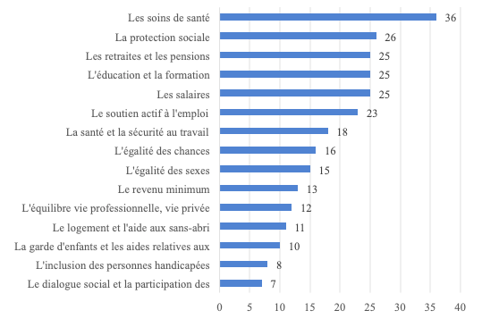 Sur le plan des opinions, interrogés fin 2020 dans le cadre d’un Eurobaromètre sur l’avenir de l’Europe, les Européens mettent très nettement en avant les sujets « sociaux », ceux en tout cas ayant trait aux disparités dans l’Union. Les sujets les plus régaliens, comme la mise en place d’une armée commune ou l’introduction de l’euro dans tous les pays de l’UE, arrivent en bas du classement. En revanche, les sujets de niveau de vie, de solidarité entre les États-membres et de politique commune en santé, sont les trois plus cités. L’Europe sociale, dans un sens large, sans être plébiscitée, fait tout de même partie des contenus jugés les plus importants au sujet de l’Europe.