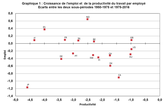 Le regard ici proposé sur les évolutions depuis le début des années 1950 apporte une confirmation forte de l’absence de relation à long terme entre les évolutions de la productivité et celles de l’emploi. Dans tous les pays développés, la productivité a fortement progressé sur la période dite des « Trente Glorieuses » qui s’étend de l’après Seconde Guerre mondiale jusqu’au premier choc pétrolier du milieu de la décennie 1970. Elle a ensuite fortement ralenti, en plusieurs vagues d’ailleurs. On peut donc comparer les évolutions de la productivité et celles de l’emploi entre l’avant et l’après milieu des années 1970 pour observer la relation ainsi obtenue. C’est ce que propose le Graphique 1 ci-dessous, sur un ensemble de pays développés pour lesquels on dispose de telles données sur longue période issues de la base statistique proposée par Bergeaud, Cette et Lecat. Cette comparaison suggère une absence totale de relation statistique : les écarts du taux de croissance de l’emploi entre les deux sous-périodes 1975-2016 et 1950-1975 ne sont pas liés avec les écarts du taux de croissance de la productivité du travail entre ces deux mêmes sous-périodes. Ainsi, dans tous les pays considérés la productivité a ralenti, l’ampleur de ce ralentissement étant d’ailleurs très contrastée entre pays, mais étant sans relation apparente avec les changements du rythme de croissance de l’emploi. Les pays dans lesquels la productivité du travail a le plus ralenti ne sont pas ceux dans lesquels l’emploi a été le plus dynamique. Autrement dit, le ralentissement de la productivité n’est pas à moyen terme favorable à l’emploi ce qui signifie à l’opposé que la productivité n’est pas l’ennemi de l’emploi.