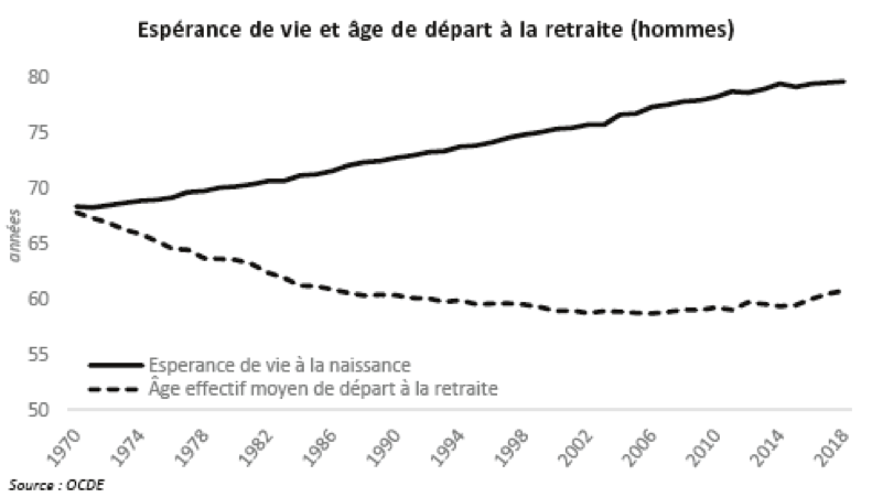 Face au vieillissement démographique, les choix politiques du passé se sont contentés de sanctuariser la retraite. Parmi les trois paramètres disponibles pour ajuster le système, ce sont principalement les contributions des actifs, par une augmentation continue de leurs taux de cotisation, qui fut priorisée sur l’allongement de la durée de cotisation, sans parler d’une modification du niveau des retraites qui n’a jamais vraiment été envisagée. Résultat, la situation des retraités français se singularise aujourd’hui par un âge effectif de départ à la retraite (62 ans) parmi les plus bas des économies avancées. Couplé à une espérance de vie record, il leur garantit un temps passé à la retraite proche de 25 ans, loin devant tous nos voisins européens - à l’exception notable du Luxembourg. Plutôt que d’évoluer en parallèle, les deux variables se sont mises à diverger dès les années 70. L’écart s’est notamment creusé avec la décision, hyper électoraliste, de François Mitterrand de rabaisser à 60 ans l’ouverture du droit de la retraite à taux plein en 1982.