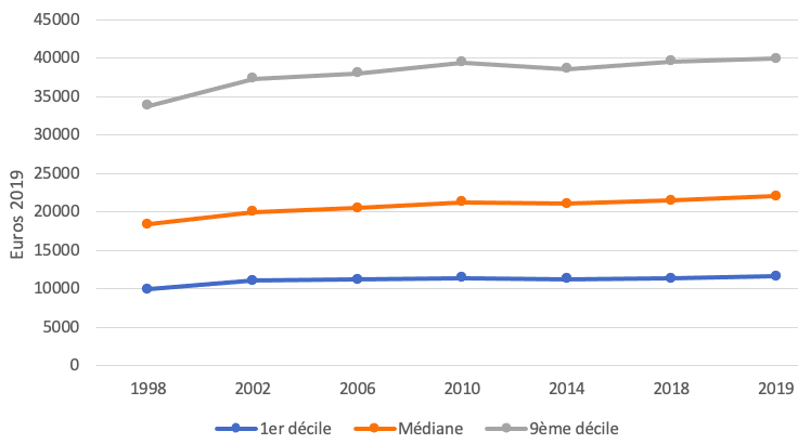 Sur la période 1998-2019 que permettent d’analyser les données de l’INSEE, plus détaillées par niveau de revenu, la réponse à cette question est clairement négative. La figure 2 montre l’évolution du niveau de vie[2] en euros constants de 1998 à 2019.
