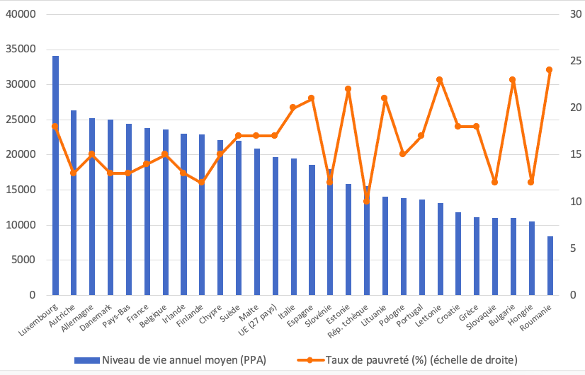 Figure 3. Niveau de vie annuel moyen en Europe (en parité de pouvoir d’achat) et taux de pauvreté (en %) en 2018