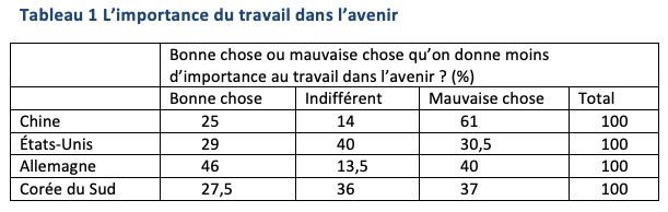 Les réponses à une autre question vont dans le même sens : les Chinois sont de loin les plus réticents à adhérer à l’idée qu’il faudrait à l’avenir réduire l’importance du travail. Ils rejettent deux fois plus souvent cette perspective que les Américains (tableau 1).