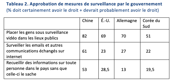 D’ailleurs, comme le montre le tableau 2, les Chinois approuvent massivement le droit pour le gouvernement de la vidéosurveillance, très largement celui du contrôle des communications sur internet et majoritairement même le recueil systématique d’informations sur les personnes. Sur ces deux derniers points, ils se démarquent très nettement des trois autres pays qui rejettent très nettement ce droit des gouvernements de surveiller étroitement leur population. On peut bien sûr s’interroger sur la sincérité des réponses à ces questions dans un pays totalitaire qui utilise systématiquement ces moyens de surveillance. Néanmoins, si les réponses n’étaient dictées que par un réflexe conformiste par crainte des autorités, il est probable qu’il n’y aurait pas l’écart de pourcentage que l’on constate dans le tableau 2 entre l’acception de la vidéosurveillance (82%) et celle, moins nette, de la surveillance systématique des individus (53%). Ces réponses montrent a minima qu’en réponse à un questionnaire anonyme la plupart des Chinois ne sont pas prêts à prendre le risque d’émettre une opinion critique ou, s’il y a plus de sincérité dans les réponses, que la préoccupation des libertés civiles vient très loin dans l’ordre de leurs valeurs, même si une minorité significative y paraît malgré tout sensible (les 47% de Chinois qui ne reconnaissent pas aux autorités le droit de recueillir des informations sur les personnes à leur insu).