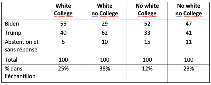 Du point de vue de la sociologie des électorats le principal handicap du président sortant est le fort soutien à Trump du segment majeur de l’électorat constitué des électeurs blancs sans diplômes (tableau 1). Près des deux-tiers d’entre eux, ce qui représente 38% de l’ensemble, ont en effet l’intention de voter pour l’ancien président.