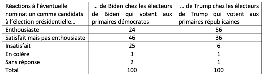 56% des électeurs de Trump qui ont voté ou vont voter aux primaires républicaines seraient enthousiastes en cas de sa nomination comme candidat à la présidence de la République. Ce serait le cas, s’agissant de la nomination de Biden, d’un quart seulement de ses électeurs votant aux primaires démocrates. Chez ces derniers 28% seraient même insatisfaits ou en colère, contre 7% des électeurs de Trump. Le candidat républicain est ainsi porté par son électorat contrairement au candidat démocrate. Il s’agit là pour ce dernier d’un handicap sérieux.