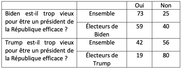 Tableau 4. Biden et Trump sont-ils trop vieux pour être des présidents efficaces ? (selon l’intention de vote présidentiel)