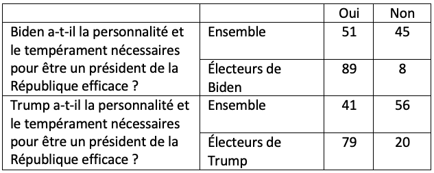 Tableau 5. Biden et Trump ont-ils la personnalité et le tempérament nécessaires pour être des présidents efficaces ? (selon l’intention de vote présidentiel)