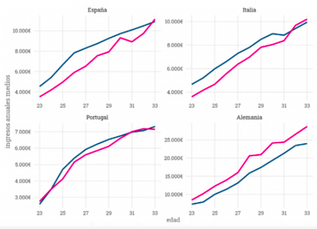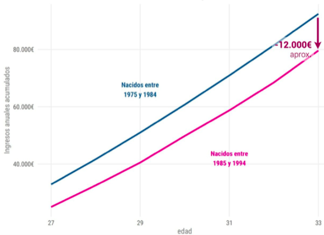 Les graphiques montrent comment, vers l’âge de 30 ans, il y a une certaine convergence entre les générations dans les deux indicateurs. Toutefois, cela n’est pas synonyme d’égalité des situations, car pour la génération de la double crise, ces années perdues d’emploi et de revenu seront difficiles à récupérer. Plusieurs études montrent que les conditions d’entrée sur le marché du travail peuvent être déterminantes quant au revenu d’une personne, tout au long de sa vie. Dans le cas de l’Espagne (figure 3), le cumul des revenus annuels moyens de chacune des deux générations, entre les âges de 23 et 33 ans, montre que les millenials atteindraient cet âge avec 12 000 euros de retard sur ceux nés au cours de la décennie précédente, soit 13% de moins.