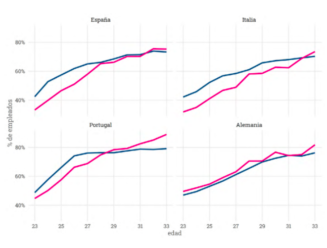 En bleu la génération née en 75-84 (bleu foncé : sans études supérieures, bleu clair : avec), en rose la génération née en 85-94 (rose foncé : sans, rose clair : avec)