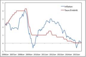 L’objectif principal de la BCE est de maintenir le taux d’inflation entre 1,5% et 2%, l’interprétation habituelle de la langue de bois officielle qui indique un taux d’inflation « inférieur à, mais proche de 2% ». Cela fait plus de deux ans que le taux d’inflation est passé en dessous de 1,5%. Après un bref passage en territoire négatif, il est à peine aujourd’hui au-dessus de zéro. C’est très embarrassant pour la BCE. En effet, il faut 18 à 24 mois pour que l’impact de la politique monétaire sur l’inflation se fasse sentir. C’est donc en 2011 qu’il aurait fallu faire baisser le taux d’intérêt. Or, en 2011, la BCE a fait grimper son taux d’intérêt, obnubilée par la montée de l’inflation créée par un boom des prix des matières premières. Mais il était déjà trop tard pour s’y attaquer.