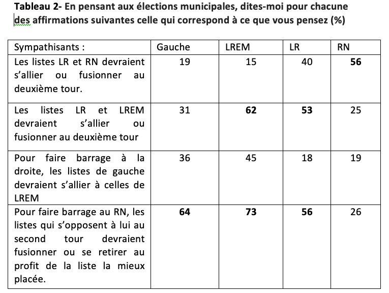 Le clivage, qui oppose sur cette question centrale les sympathisants de LR et du FN à ceux des partis de gauche et de LREM, aurait pu permettre la reconstitution d’une sorte de clivage gauche/droite. Or les choix d’alliances des différents groupes de sympathisants concernant les prochaines élections municipales montrent que les proximités existantes sur cette question ne suffisent pas à constituer un tel axe qui réorganiserait le fonctionnement du système politique. C’est ce que montre le tableau 2 qui établit les préférences des sympathisants des quatre groupes concernant les stratégies d’alliances pour ces élections.