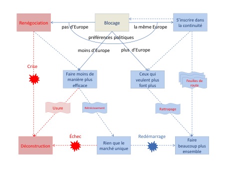 Les différents scénarios possibles comportent donc une série de risques d’ordres variés, correspondant principalement à : (i) la nécessité de trouver à chaque étape un accord sur le périmètre de coopération et ses modalités institutionnelles, (ii) la méthode de construction, dès lors que l’on sort de la méthode communautaire traditionnelle ; et (iii) la possibilité de dysfonctionnements majeurs au sein d’unions mal conçues, dès lors que les compromis politiques qui en déterminent le contenu et le périmètre laisseraient de côté des instruments essentiels à leur bonne marche non seulement en temps normal mais aussi face aux chocs.