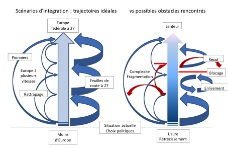 Pour se concentrer sur la trajectoire conduisant vers davantage d’intégration avec ou sans le bénéfice d’un groupe pionnier, deux schémas peuvent illustrer le contraste entre un processus ordonné couronné de succès, et le risque d’un déraillement provoqué par la matérialisation de risques et de forces centrifuges, dont le passé nous a donné de multiples exemples sur le chemin de la construction européenne.