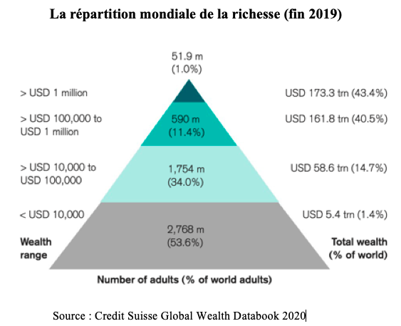 Les milliardaires incarnent des extrêmes, mais leurs évolutions sont bien moins déterminantes que celles des millionnaires. Dans son rapport annuel, publié en 2020, sur la richesse en 2019, la banque Credit Suisse propose ainsi une synthèse de la stratification sociale mondiale selon le patrimoine (calculé en dollars). Il en ressort 52 millions d’adultes (soit donc 1% de la population mondiale des adultes) avec un patrimoine supérieur à un million de dollars. 590 millions d’individus (11% de l’humanité adulte) disposent d’un patrimoine se situant entre 100 000 et 1 million de dollars.