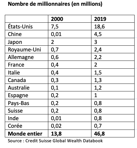 Les évolutions sont très rapides, puisqu’au début de l’année 2019, Credit Suisse ne recensait que 46,8 millions de millionnaires. Au tournant du millénaire, le monde ne comptait que 14 millions de millionnaires en dollars (soit 0,4% de la population adulte).
