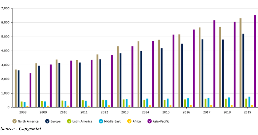 Une autre approche du nombre de millionnaires, élaborée par Capgemini, consiste à ne compter comme millionnaires que les individus qui possèdent un million de dollars d’actifs investissables, hors résidence principale, objets de collection, consommables et biens de consommation durables. Ils sont donc moins nombreux que dans l’approche Credit Suisse. Ils étaient 8,5 millions en 2008. Ils sont 19,6 millions en 2019.