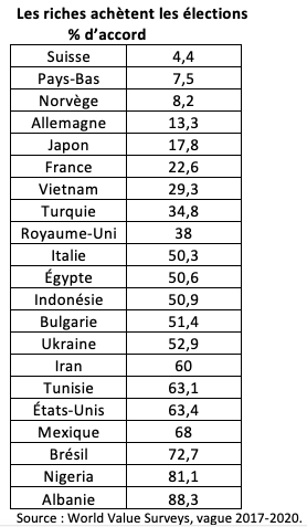 À la question « les riches achètent-ils les élections ? », les proportions de population répondant, en 2018, « souvent ou très souvent » varient considérablement, de moins de 5% en Suisse à près de 90% en Albanie. C’est peu dire que le monde n’est pas unifié dans les considérations nationales à l’égard de la richesse (quelle que soit sa définition).