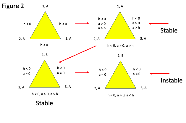 Triangle instable (en haut à gauche) stabilisé par une coalition supranationale qui génère une propension positive a d’amplitude plus grande que la propension historique négative h, rendant les propensions effectives toutes positives (en haut à droite). Le triangle est désormais stable avec les trois pays dans la même coalition A. Quand un pays quitte la coalition supranationale, la propension associée s’annule (en bas à gauche pour le pays 1). Cependant le triangle reste stable car la propension effective entre 2 et 3 est toujours positive. Mais un affaiblissement de la propension supranationale la rend négative, ce qui réintroduit l’instabilité triangulaire initiale (en bas à droite).