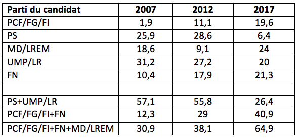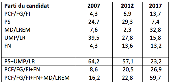A partir de l’élection présidentielle de 1988, le surgissement d’un fort électorat d’extrême-droite avait déjà mis fin à la parfaite bipolarisation du système partisan. Les tableaux 1 et 2 concernant les élections présidentielles et législatives de 2007, 2012 et 2017 permettent d’observer les transformations nouvelles, en 2007 et en 2012, de la structure électorale, puis son effondrement en 2017.