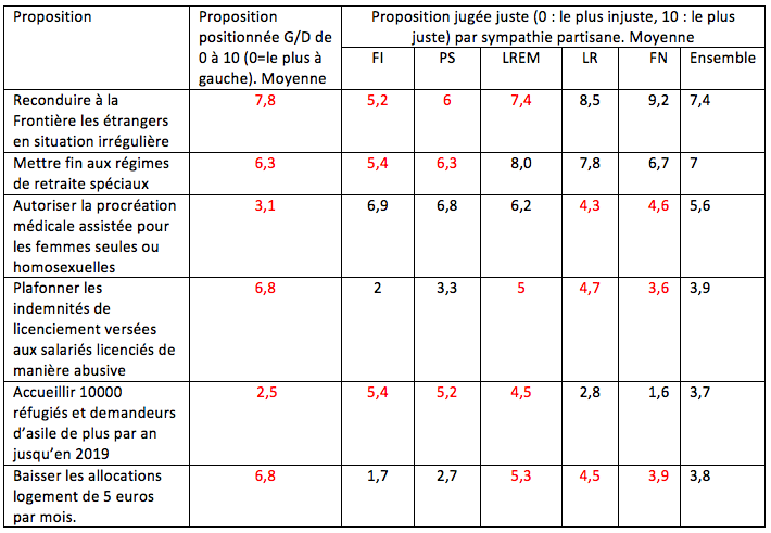 D’abord, les sympathisants de FI et du PS ne trouvent pas nécessairement justes les politiques qu’ils considèrent comme de gauche. Ils sont en effet une majorité à considérer comme justes la reconduite à la frontière des étrangers en situation irrégulière et la fin des régimes spéciaux de retraite et ils ne sont qu’une moitié à considérer comme juste l’accueil de nouveaux réfugiés. En revanche, les sympathisants de LR et du FN ne considèrent pas majoritairement justes la limitation des indemnités de licenciement et la baisse de l’allocation logement. En revanche, ils sont près d’une moitié à considérer comme juste la PMA. Ensuite, les sympathisants de LREM, selon les cas, sont proches tantôt des sympathisants de FI et du PS, tantôt de ceux de LR et du FN. Jérôme Jaffré estime que « le président a réussi à associer libéraux de droite et raisonnables de gauche. Il a réalisé, hors partis mais dans les urnes, ce qu’on appelait, dans l’entre-deux-guerres, la conjonction des centres », ce qui, selon lui, ne remet donc pas en cause la réalité de la gauche et de la droite.