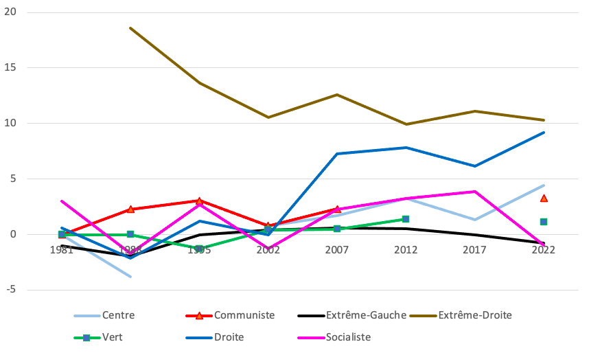 Graphique 1. Contenu net anti-mondialisation des professions de foi par famille politique – 1981-2022