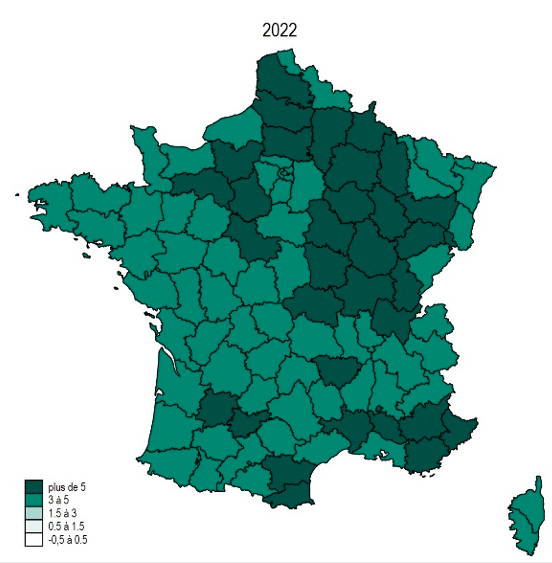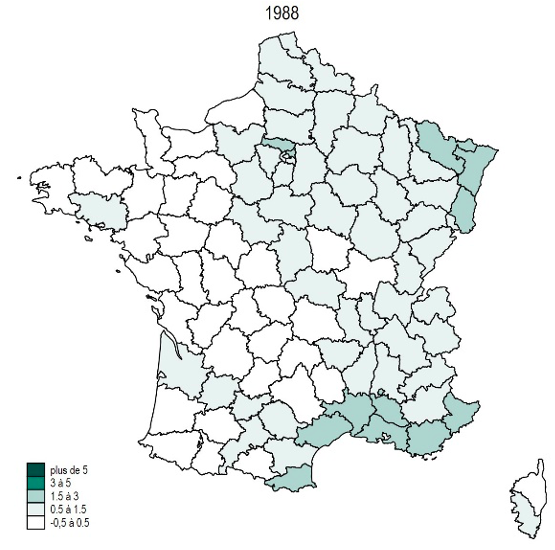 Cet indicateur peut aussi se calculer au niveau départemental, en tenant compte du contenu des professions de foi et du score obtenu par les candidats nationaux au niveau local. Le graphique 2 présente cet indicateur local de vote anti-mondialisation en 1988 et en 2022 (la carte de 1981 est vert clair, quasi-uniformément). L’échelle des couleurs est identique entre les deux dates. Le vote anti-mondialisation croit donc nettement et cette progression concerne tous les départements. Il est fort dans l’est et le sud-est de la France. Si les départements de la façade atlantique étaient peu concernés par le vote anti-mondialisation en 1988, il est à un niveau élevé aujourd’hui dans cette partie de la France, même si son importance est moindre que dans l’est et le sud-est du pays.