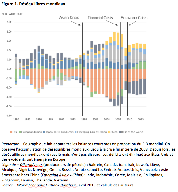 Dans deux articles publiés en 2008, nous montrions que les « déséquilibres mondiaux » de la fin des années 1990 et du début des années 2000 (Figure 1) résultaient principalement de la capacité inégale des différents pays à produire des actifs sûrs, et de la discordance entre cette capacité et la demande locale pour ces actifs. Nous notions en particulier que les Etats-Unis étaient le principal producteur d’actifs sûrs, quand la Chine, les pays producteurs de pétrole (surtout au Moyen-Orient) et le Japon étaient les principales sources de la demande pour ces mêmes actifs. Pendant plus de deux décennies, une pénurie grandissante d’actifs sûrs au niveau mondial a contribué à faire baisser fortement et durablement les taux d’intérêt mondiaux. Les flux de capitaux ont servi de mécanisme de propagation : les régions affectées par une pénurie d’actifs sûrs ont tiré vers le bas les taux d’intérêts des régions qui en produisaient.